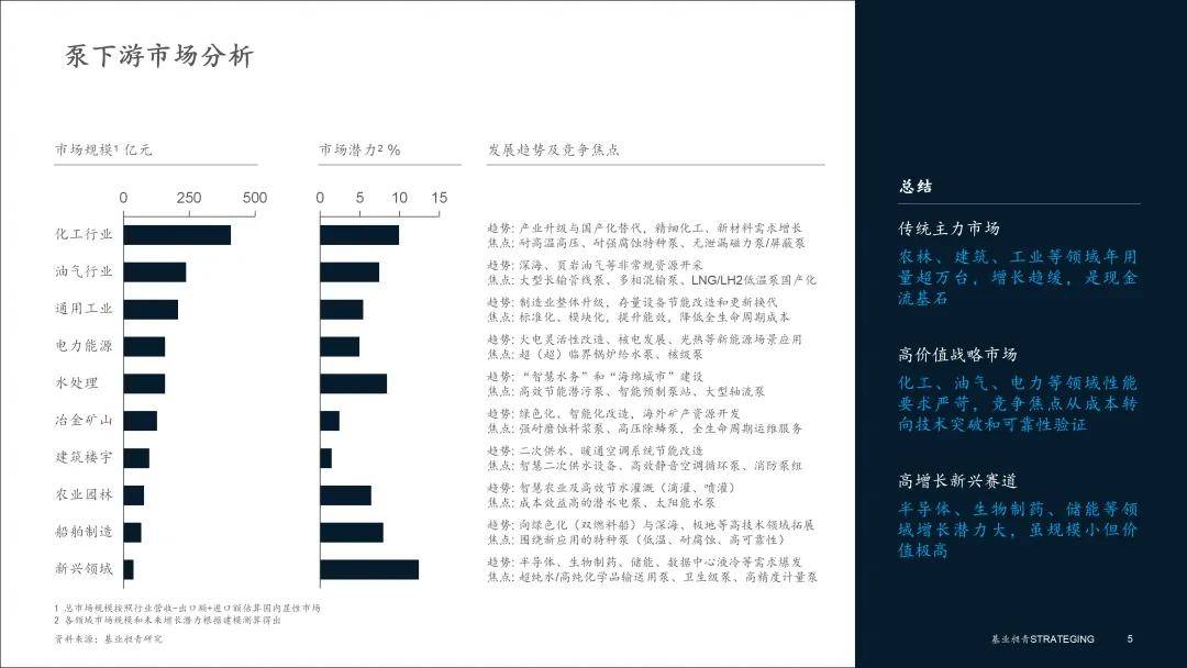 泵行业的下游应用领域极其广泛◇,形成了需求各异、价值悬殊的市场格局。行业的增长动能正随着下游应用领域的深刻变革而重构。传统市场是稳定行业基本盘的“压舱石”,而以高新技术为代表的战略性新兴产业,则成为决定行业未来价值高度的“主战场”。