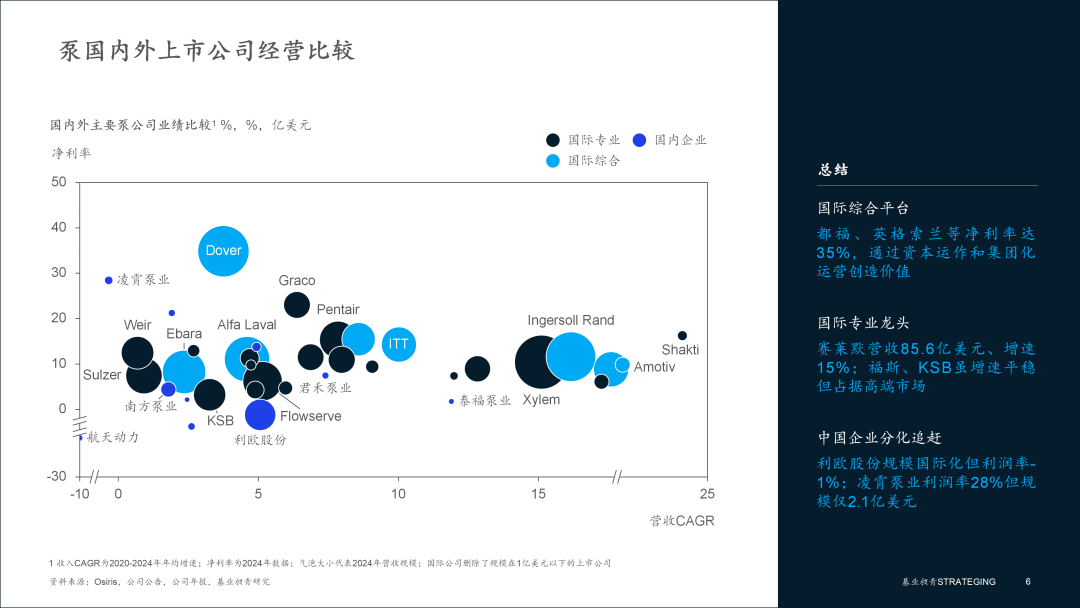 ▪ 国际综合平台:资本与运营驱动的“全能选手”◆。以都福 (Dover) 和英格索兰 (Ingersoll Rand) 为代表◆□•,它们的核心优势在于卓越的资本运作和集团化运营能力▲■●。他们并非纯粹的泵制造商,而是将泵业务作为其多元化工业版图的一部分☆◆○。例如,都福凭借其强大的业务组合管理能力,在4%的温和增速下实现了高达35%的惊人净利率。而英格索兰则通过成功的并购整合▽,获得了16%的高复合增长率,并维持了12%的稳健盈利-•○。它们展现了通过资本和管理创造价值的强大实力…。