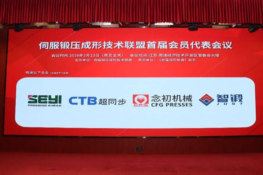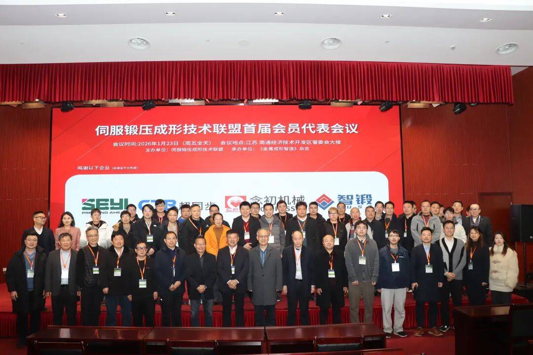 2026 年 1 月 23 日△,伺服锻压成形技术联盟首届会员代表会议在江苏南通经济技术开发区能达大厦成功召开。本次会议由伺服锻压成形技术联盟主办、《金属成形智造》杂志承办,金属成形技术与重型装备全国重点实验室协办,伺服锻压成形领域的企业代表、科研专家、高校学者等各界人士齐聚一堂,以“凝聚行业力量,推动技术创新” 为核心,共商联盟发展大计,见证行业发展新起点。